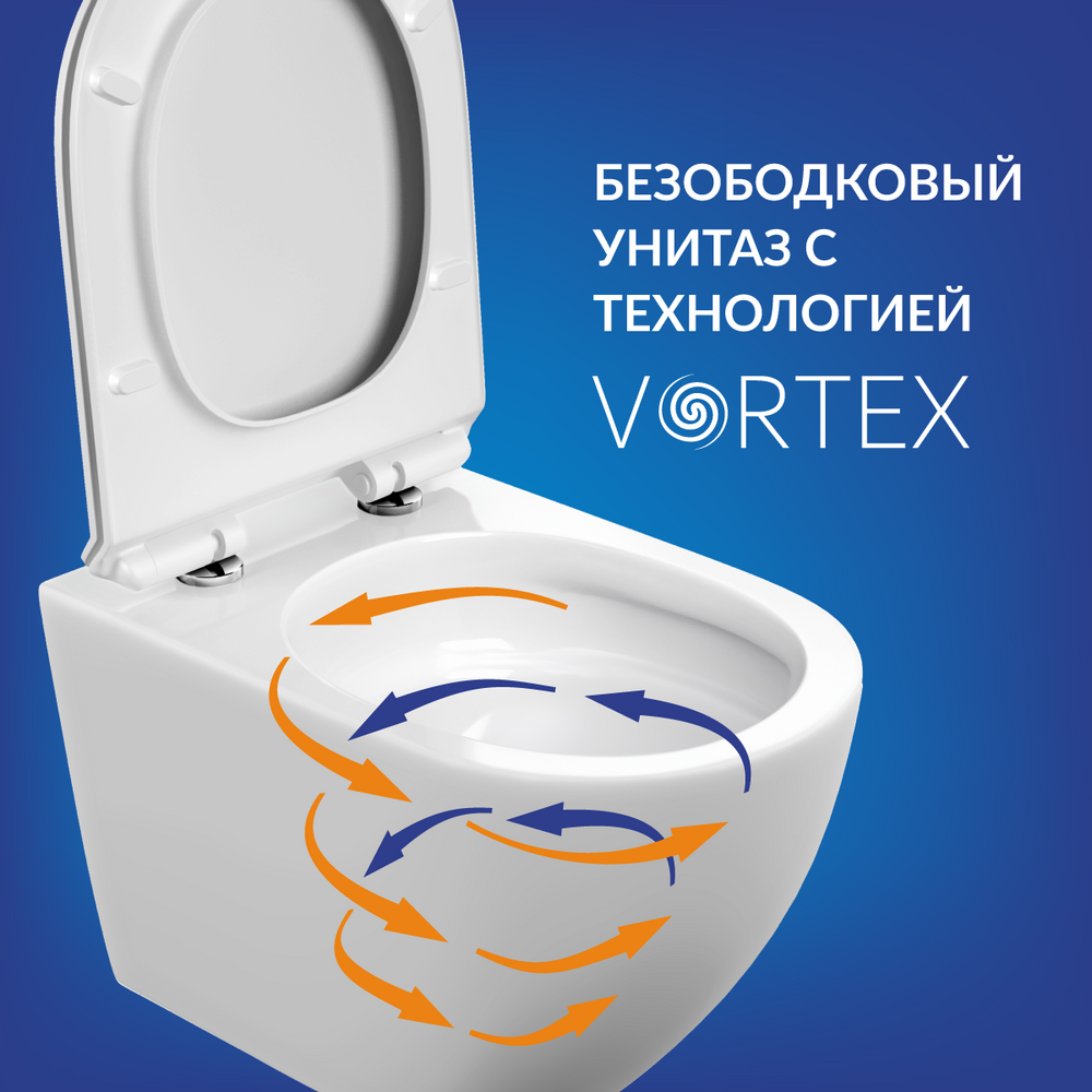 Продуманная система смыва Vortex образует воронку из потока воды внутри чаши. Мощный вихрееобразный поток эффективно и качественно омывает чашу без образования выплеска и с минимальным шумом.