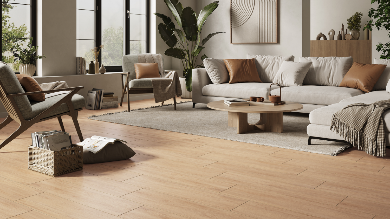Керамогранит под дерево — это материал, который долго не выйдет из моды благодаря своей натуралистичной текстуре. Высокоточная графика воссоздает чёткий узор волокон и годовых колец, а лёгкий рельеф делает плитку объемной.