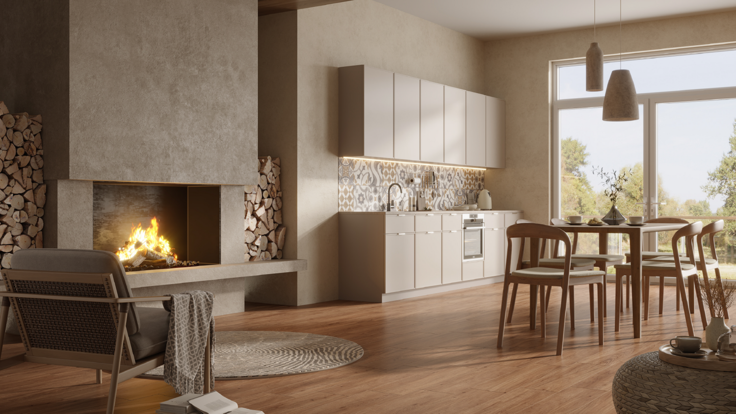 - Насыщенный тёплый оттенок с контрастным рисунком наполняет уютом пространство