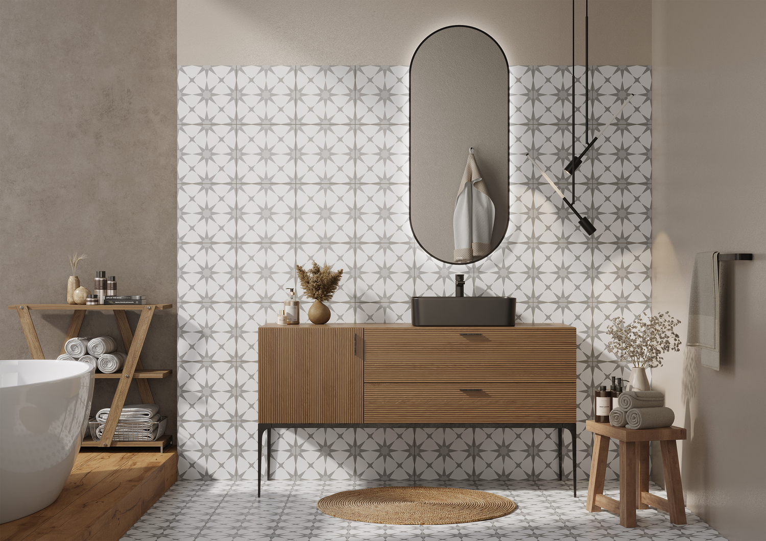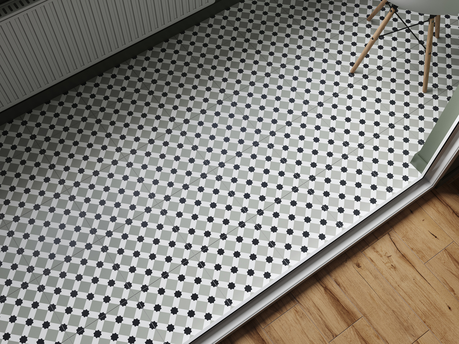 Керамогранит Starlight со звездным пэчворк-узором привносит в интерьер космическую романтику, превращая любое пространство в утончённую игру света и тени. Рисунок плитки динамичен, но ненавязчив благодаря приглушенному оттенку. Материал идеально сочетается с деревом и натуральными текстурами и в своём тандеме органично смотрится как на стене, так и на полу.