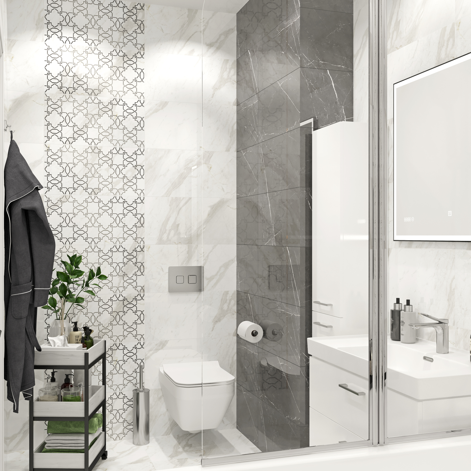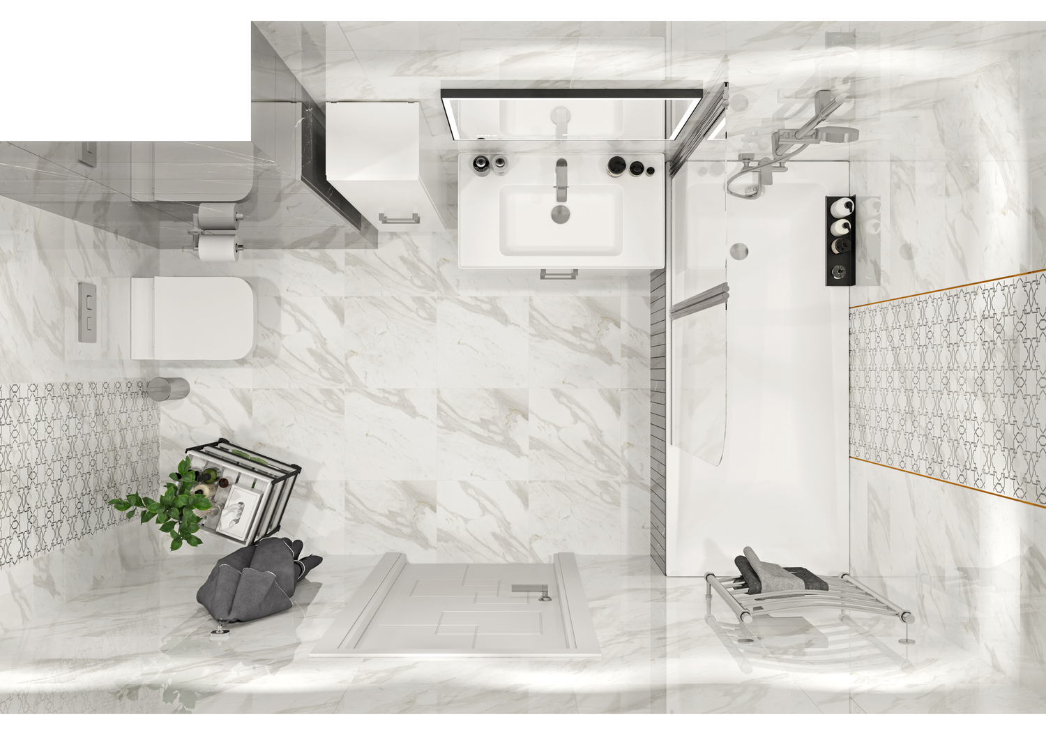 Чтобы ваш интерьер был по-царски величественным и каждый раз заставлял вас расправить плечи, отделайте его камнем или плиткой «под камень». Выберите материал с реалистичным рисунком мрамора, как в коллекции ROYAL STONE ORNAMENT, который создаёт 3D-объём в пространстве с помощью карвинговых чернил. Любая ванная комната с такой отделкой становится визуально просторнее.