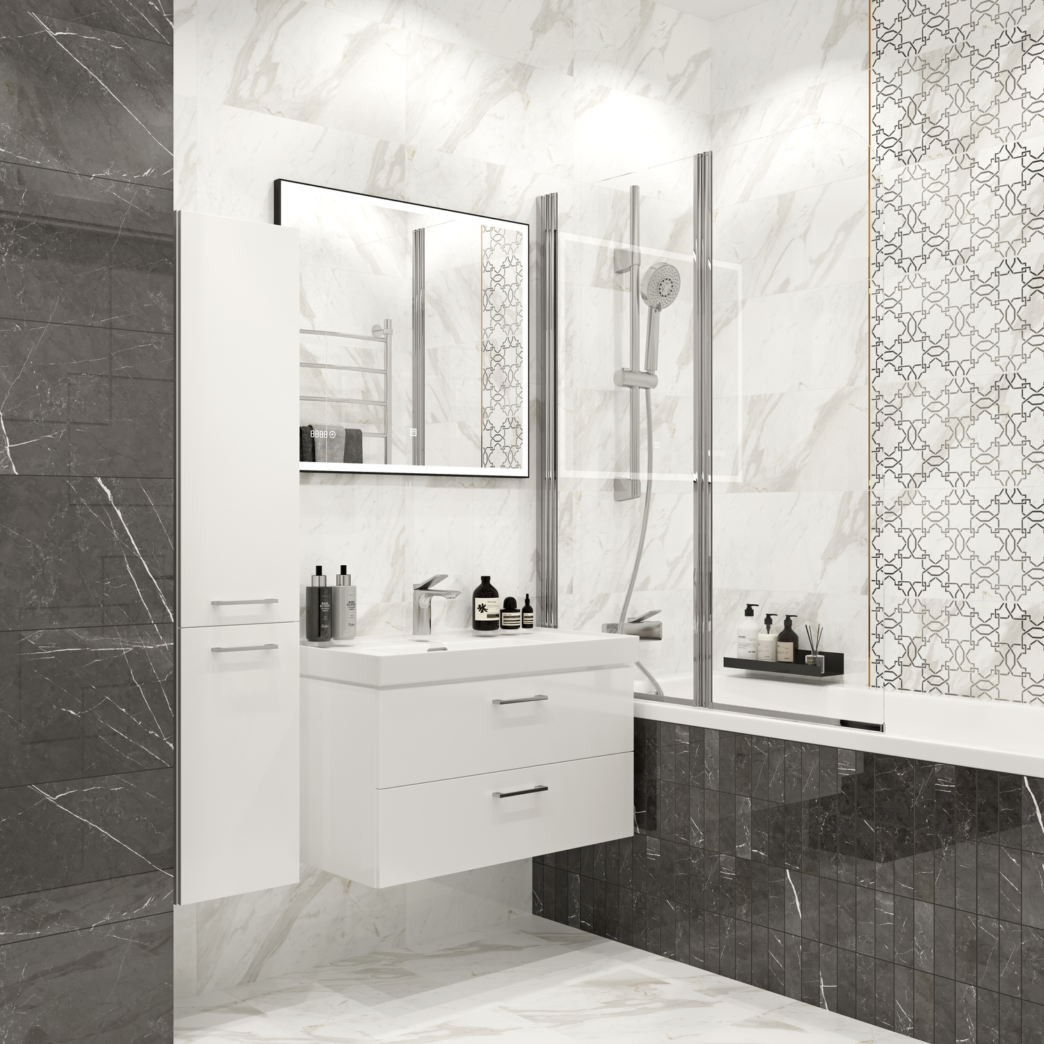 Добавьте зеркало с деликатной подсветкой по контуру LED 011 и подвесной унитаз монолитной формы CREA RECTANGULAR. К широкой подвесной тумбе LARA подберите встроенную раковину прямоугольной формы. Всю сантехнику объединят строгие, но плавные линии. Чёрную глянцевую мозаику ROYAL STONE ORNAMENT дополнят декоративная вставка с геометричным рисунком и металлический бордюр. По-царски прекрасно!
