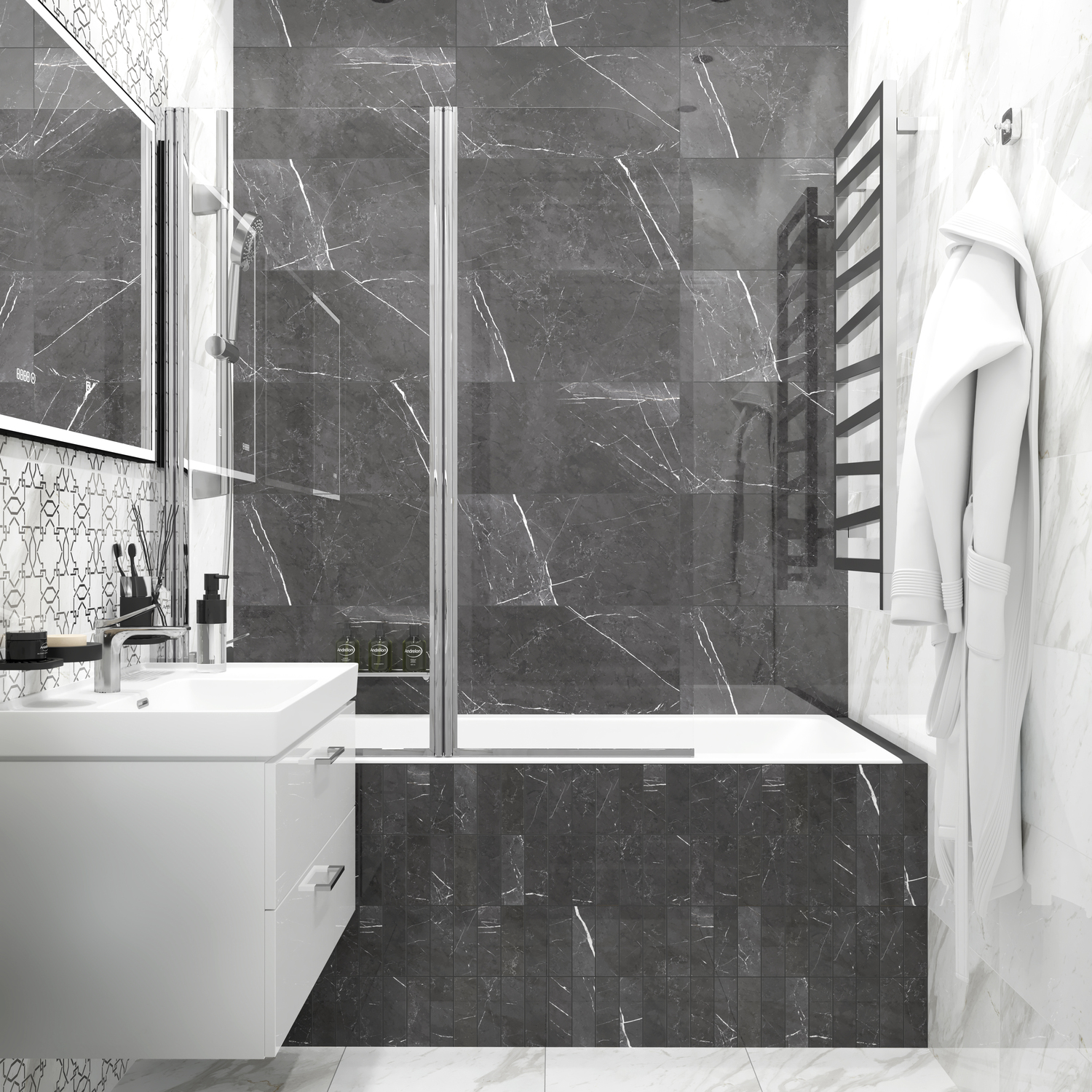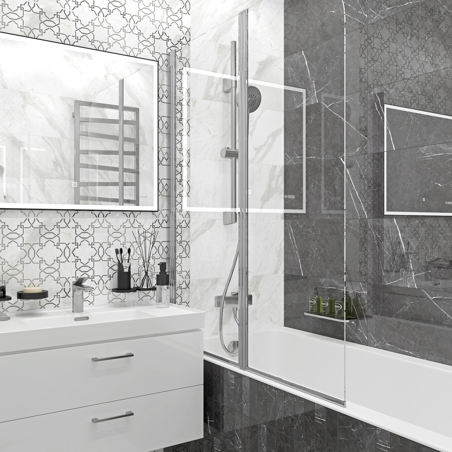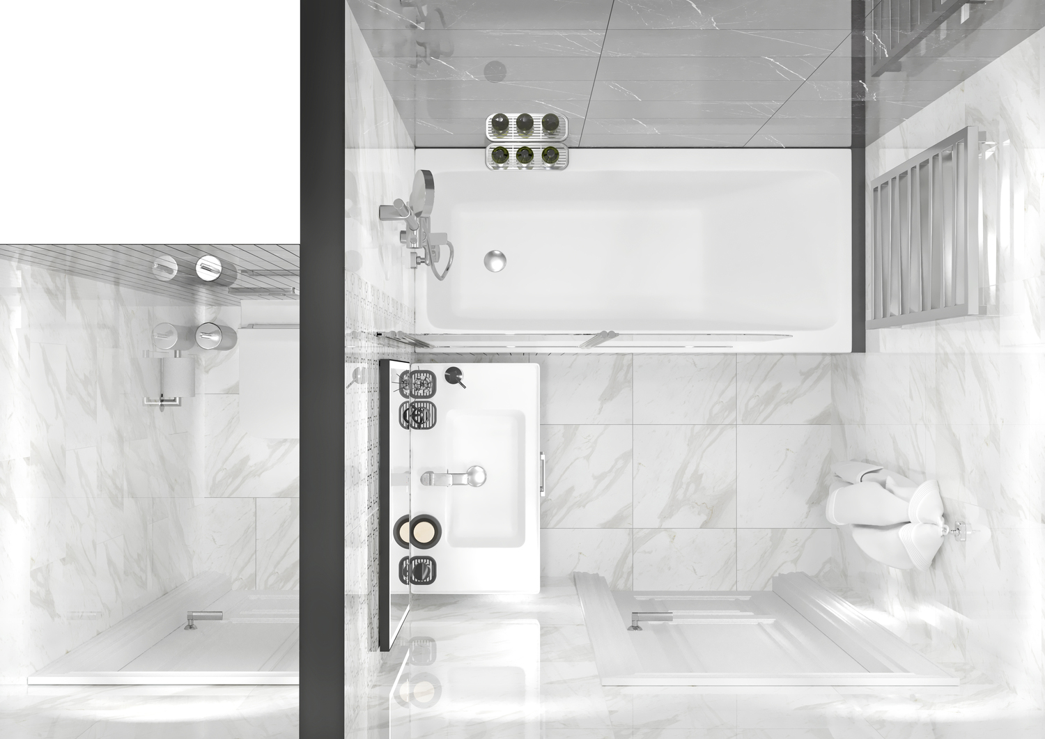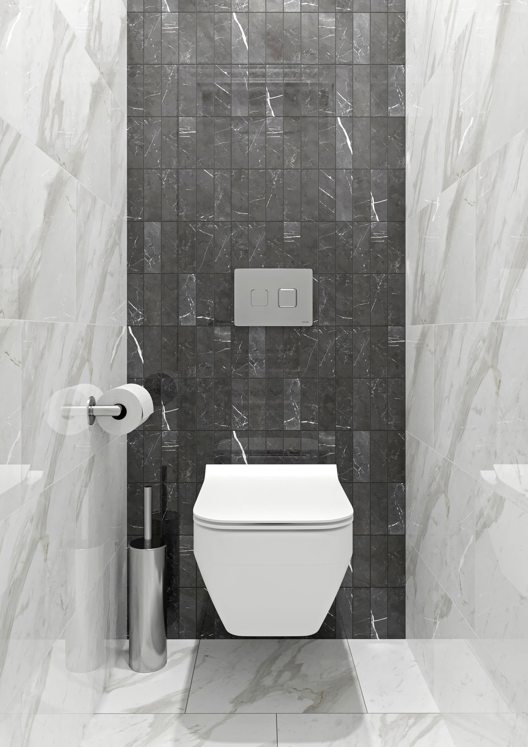 Маленький, да ещё и разделённый санузел — непростая задача для тех, кто планирует ремонт и наполнение интерьера. Но даже с этой задачей можно справиться, если в доме есть рулетка. Да, половину ванной комнаты однозначно займёт ванна — CREA. Треть оставьте под вместительную тумбу LARA, на которой расположится встроенная прямоугольная раковина. Главным героем соседнего помещения станет монолитный компактный подвесной унитаз CREA RECTANGULAR. Благодаря нему в комнате останется свободным пол, что визуально сделает её просторнее. Отделка «под мрамор» добавит объёма и зеркального блеска, отчего ваш небольшой санузел покажется вам чуть больше.
