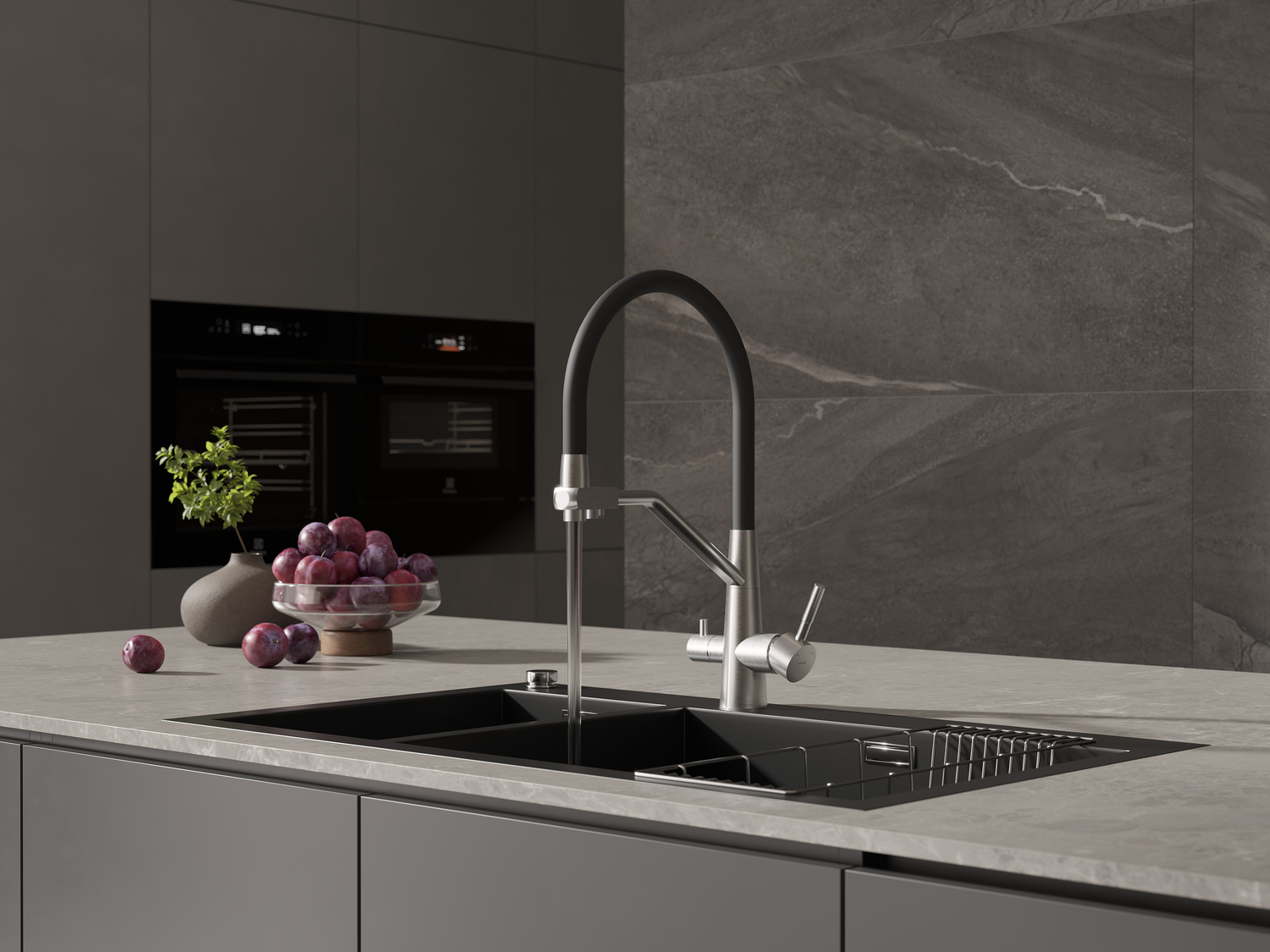 Смеситель с одной ручкой для проточной и фильтрованной воды компактен и подходит для небольших кухонь, где на счету каждый сантиметр. В разных положениях ручки обеспечивается подача проточной или питьевой воды. Внутри излива потоки не пересекаются, поскольку для каждого из них предусмотрен отдельный шланг. Это высокотехнологичное решение не только экономит место, но и избавляет от визуального шума на кухне.