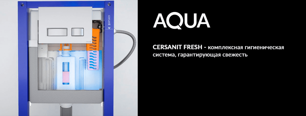 Cersanit FRESH — неотъемлемая часть инсталляций Cersanit AQUA 40 и AQUA 50. По сути, это встроенная система свежести, которая имеет вид небольшой пластиковой корзинки, куда закладывается чистящее средство в таблетках. Медленно растворяясь, оно подаётся в унитаз при каждом смыве.