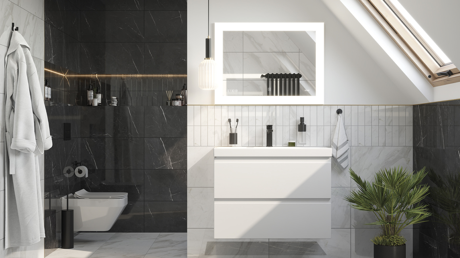 Белый и светло-серый — это классическое, вечное сочетание. В 2025 году акцент делается не на стерильную белизну, а на сложные оттенки — молочный, алебастровый. Это создает четкий, графичный и очень чистый образ, подчеркивая безупречность линий черного смесителя или мебели.