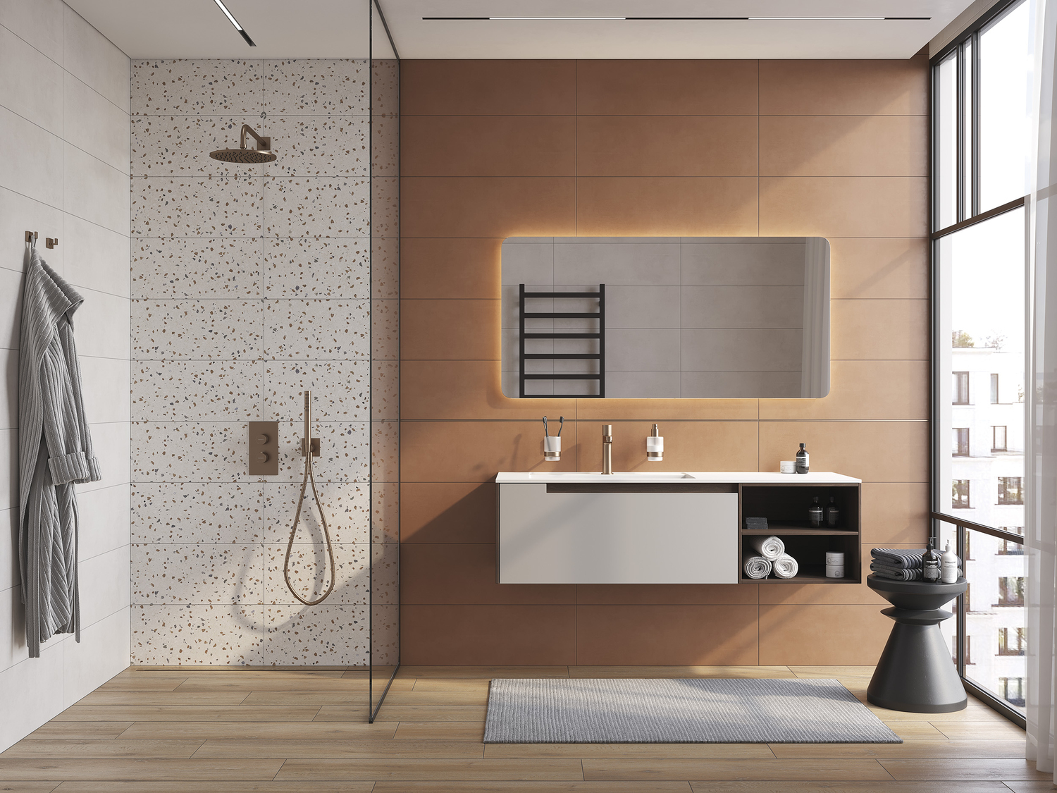 Металл всегда присутствовал в дизайне ванных комнат: смесители, держатели, полотенцесушители и прочая атрибутика, как правило, выполнены из нержавеющей стали, латуни в комбинации с медью, алюминия, матового чёрного металла. Эти материалы устойчивы к воде и не боятся коррозии, что актуально в комнате с повышенной влажностью.
