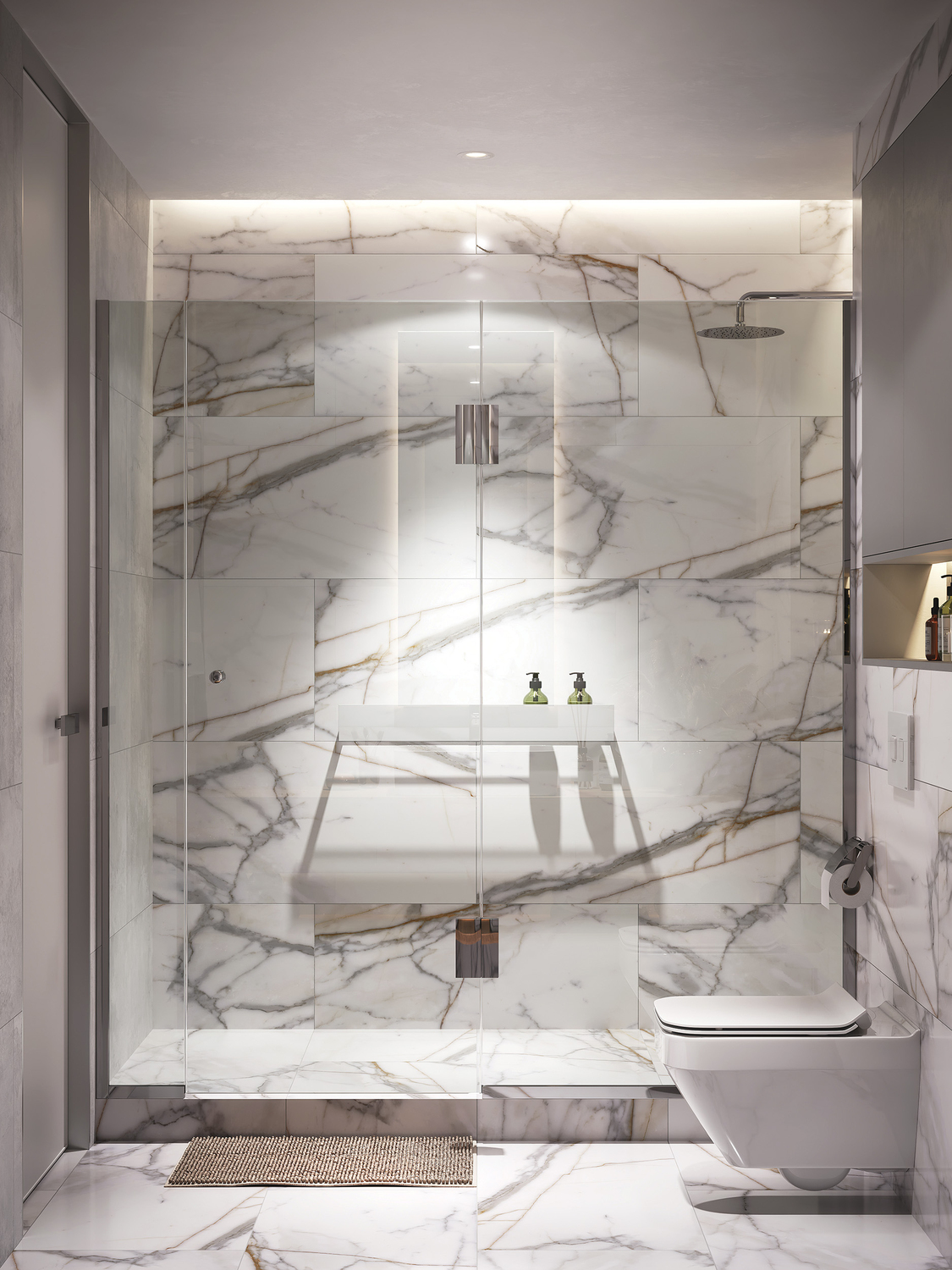 Aura— светло-серый и бежевый керамогранит под мрамор сделает помещение чувственным и изящным.