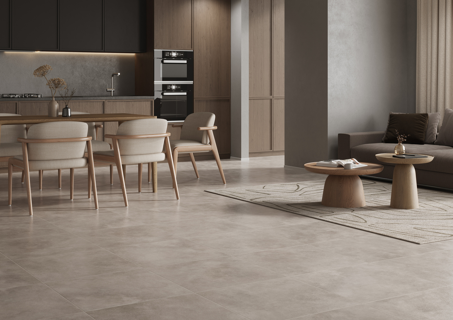 В коллекцию Residence входит керамогранит под бетон в двух мягких и приятных оттенках. Матовая текстура с лёгким рельефом реалистично имитирует натуральную бетонную поверхность с небольшими выемками, подходящую для отделки современных интерьеров. Бетон в этой коллекции комфортный и уютный — этими чертами он наполняет всё помещение.