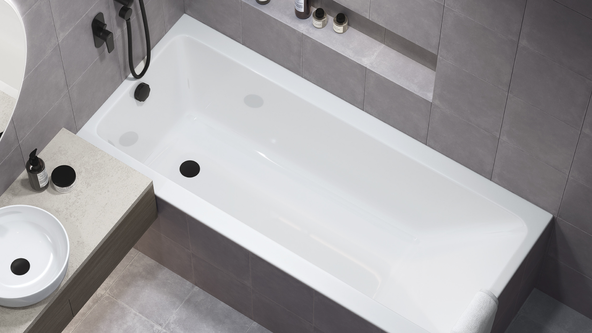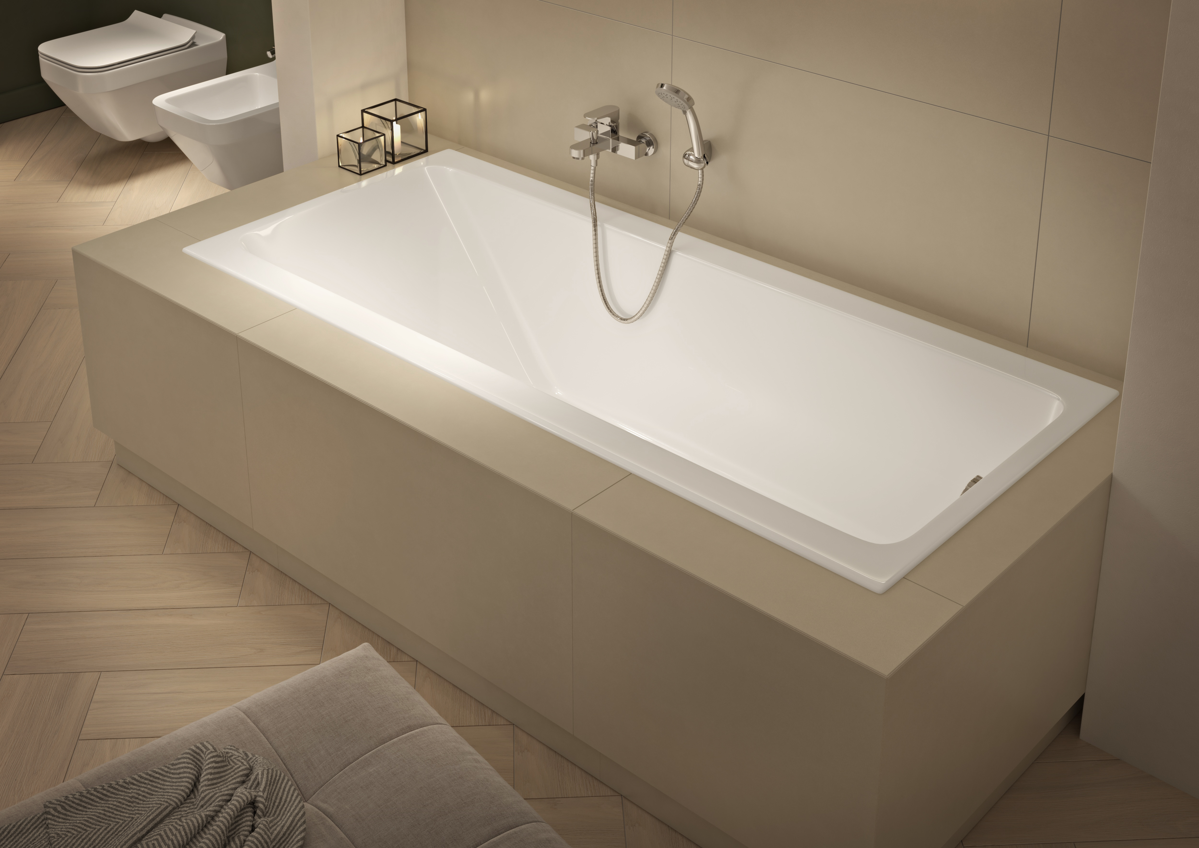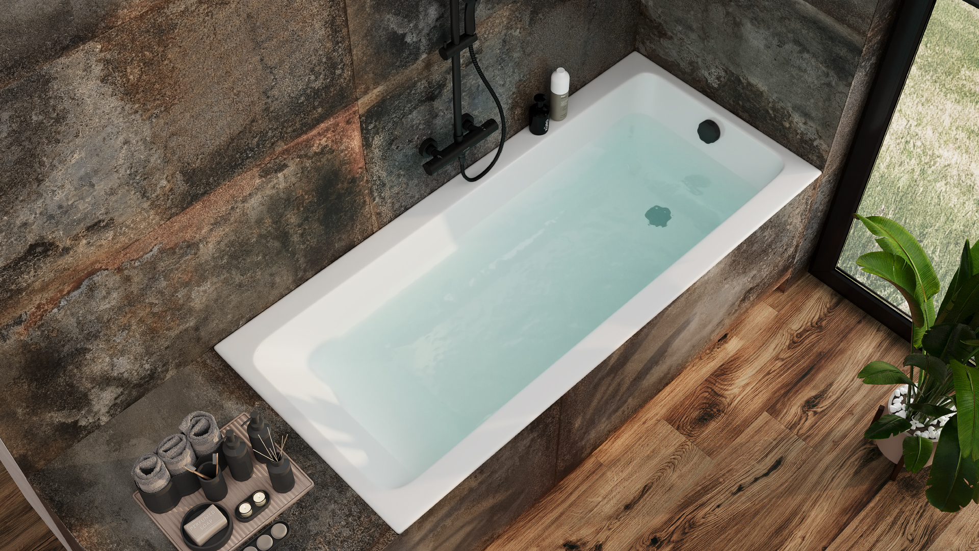 Если «утопить» ванну в стене, это превратит зону в уютное, защищенное пространство. Реализация задумки такова. Выстраивается декоративная стенка или углубляется существующая, в которую и монтируется ванна. Торцевую часть этой ниши также облицовывают плиткой. Глубокая чаша Crea идеально подходит для этого решения. В итоге получается приватный и очень уютный уголок для релаксации. В нише над ванной можно разместить полку для аксессуаров или бра для мягкого направленного света. Если пространство позволяет, нишу можно сделать не только с торца, но и сбоку, организовав там место для хранения банных принадлежностей.