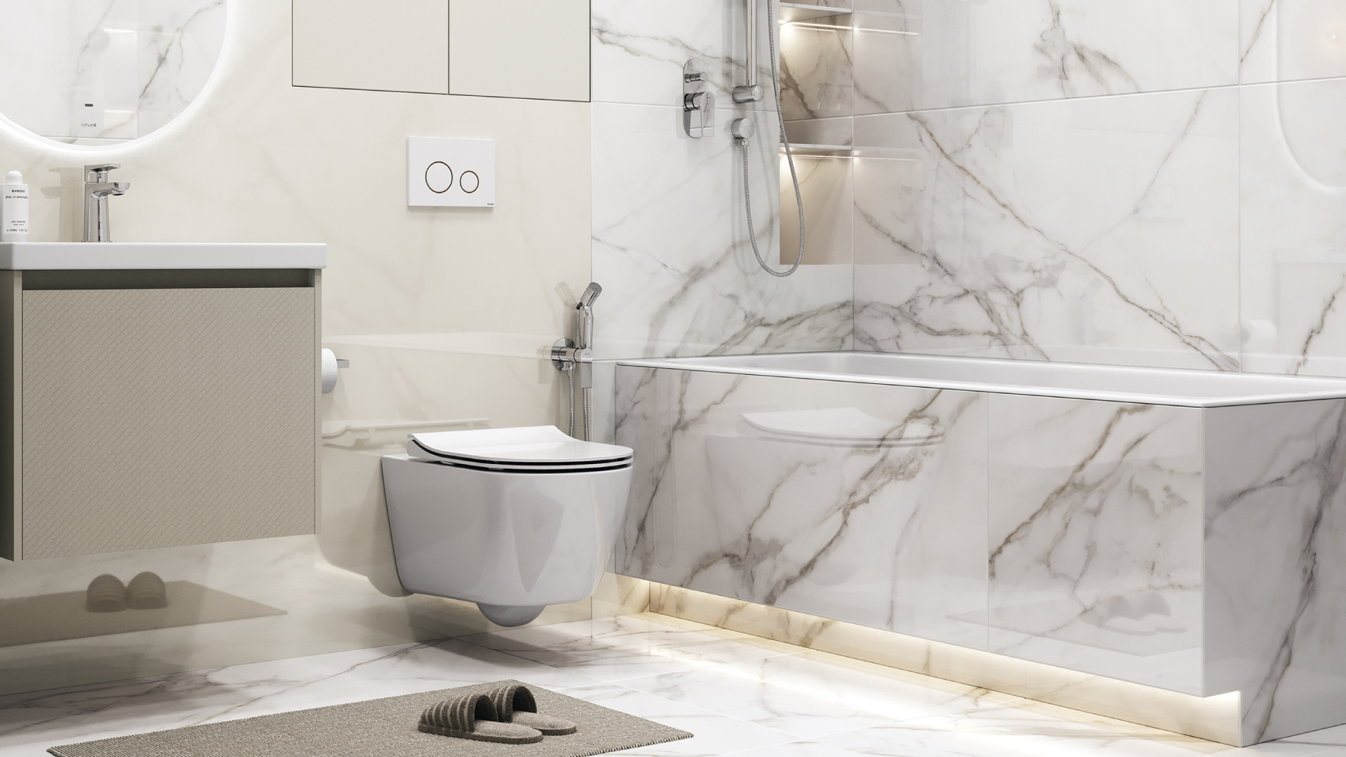 Тонкий бортик ванны Crea идеально стыкуется с плоскостью подиума. Это добавляет интерьеру скульптурности и роскоши. В подиум можно встроить светодиодную подсветку. Теплый свет, рассеивающийся снизу, визуально «приподнимает» ванну над полом и создает расслабляющую атмосферу вечером.