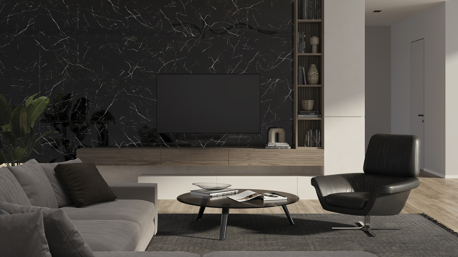 - Универсальное решение для помещений любых назначений. Нередко крупноформатная плитка перебирается из кухонь в гостиные и даже в спальни. Современные текстуры позволяют использовать её где угодно