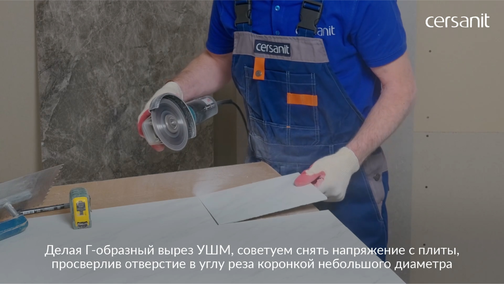 Не пытайтесь вырезать весь угол сразу. Сделайте несколько прямых пропилов УШМ или лобзиком, аккуратно разломив и удалив лишние сегменты, а затем зачистите внутренний угол. Лучше всего в углах сначала просверлить отверстия, чтобы снять напряжение с плиты, и только после этого делать прямые резы между отверстиями.